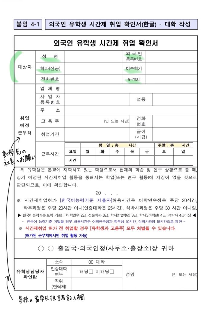 この様式はハイコリアの뉴스 공지(ニュース・告知)→민원 서식(民間申請書式)→上から4段目の右側の書式외국인유학생 시간제취업 확인서(外国人留学生時間制就業確認書)でダウンロードできます。一応PDFで共有しておきます。
